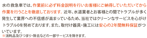 荒川区の皆様へ、水の救急車荒川区店からのお約束です。隅田川の美しい景観にふさわしい、親切丁寧な接客、常に清潔な服装での訪問、透明性の高い安心価格、そしてすべての作業に先立って行うわかりやすい説明を保証します。荒川区に密着したサービスで、皆様の水回りの問題を迅速に解決いたします。